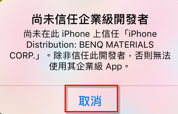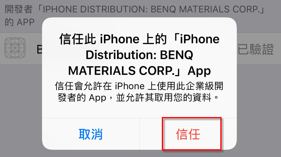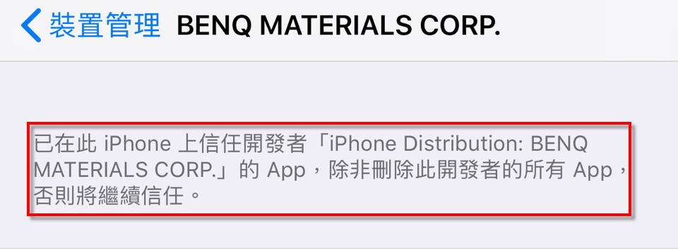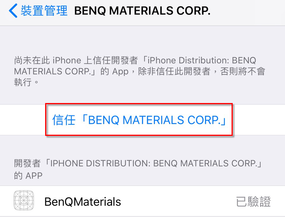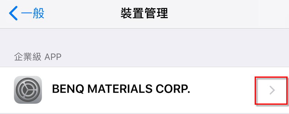 3.設定 > 一般 > VPN與裝置管理,選擇「BENQ MATERIALS CORP.」
